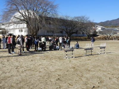 1月26日(金)に科学実験教室がありました。6年生はロケットの作成と打ち上げです。本物のロケットにも搭載されている火薬を使用するということもあり、「どんなふうに打ちあがるの?」「自分のロケットはちゃんと打ちあがってくれるのかな?」わくわくドキドキ。当日は、雲一つない晴天に恵まれ、風もない絶好のロケット日和。自分のロケットが空高く打ちあがる様子に興奮する子どもたち。自分で作ったものが目の前で打ちあがる体験はなかなかできないものです。先日、ピンポイントに日本製の探査機が月面着陸を成功させたニュースがありましたが、この体験から、宇宙やロケットに興味をもってもらえるとうれしいです。