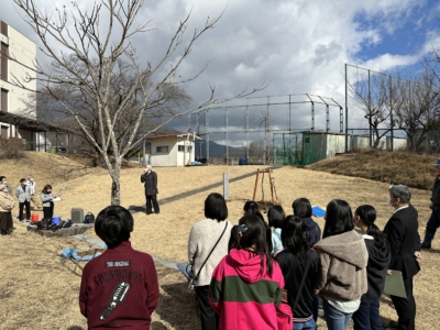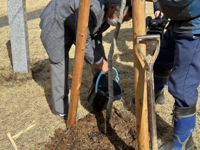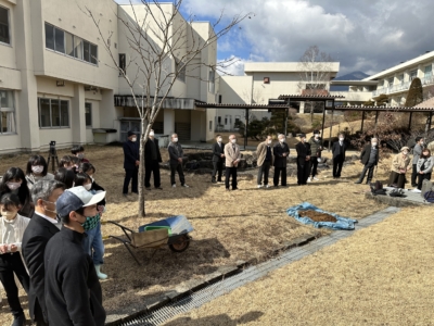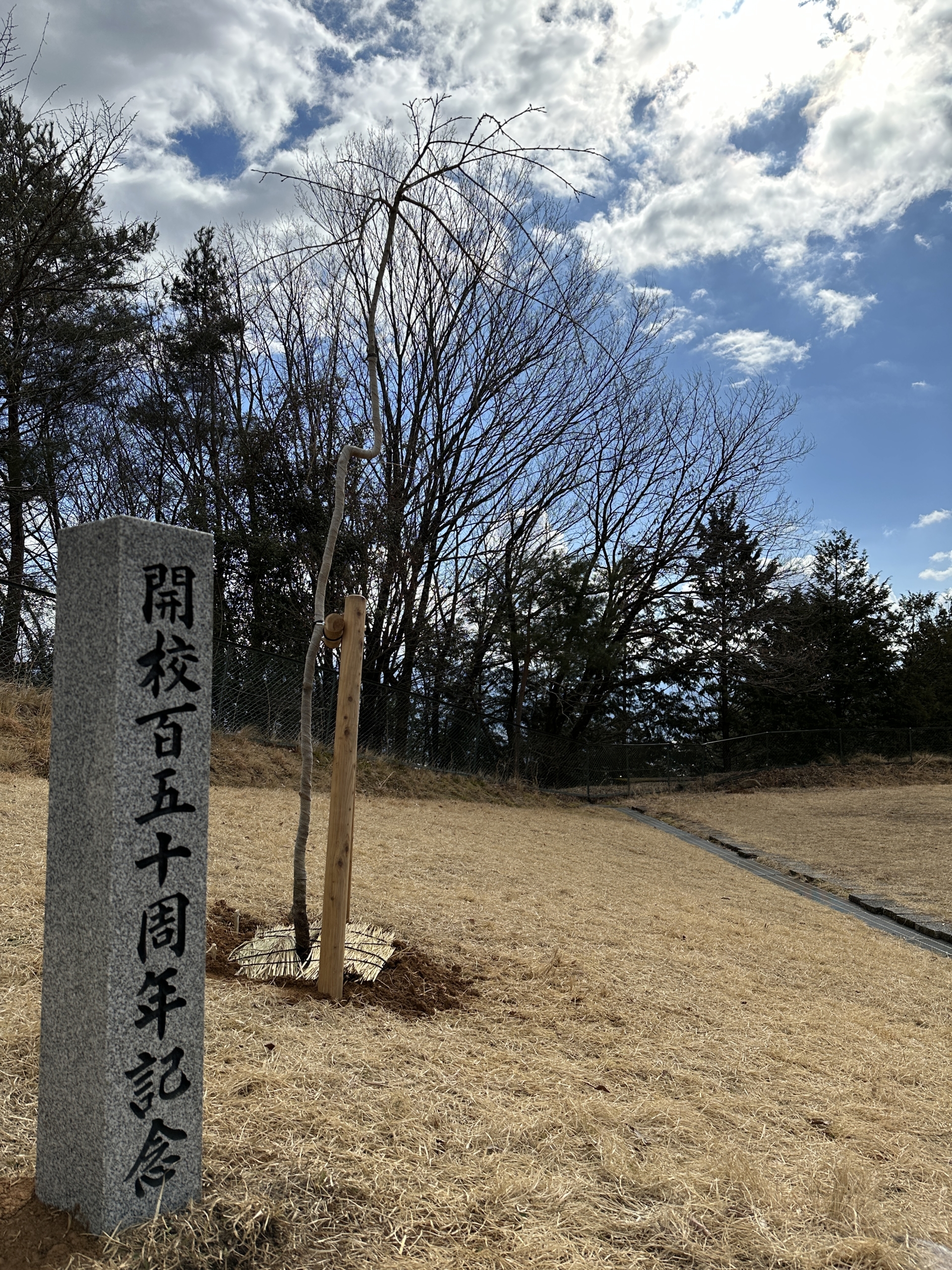 150周年記念樹植樹式 今年は開校150周年。 秋に記念式典を行いましたが、その時に自治会から桜の苗木を寄贈していただきました。 定植の時期を待って、いよいよ25日に植樹式を行うことができました。 麻績の里の舞台桜は有名で、春には各所から花を見にくる観光スポットになっています。 今回はそんな枝垂れ桜を寄贈していただきました。 まだひょろっとしていて、頼りないですが、10年後、20年後と子どもたちの成長に合わせて太く大きくなっていく桜を大切に育てていきたいです。 編集者2023-02-26T19:47:41+09:002023年02月26日|