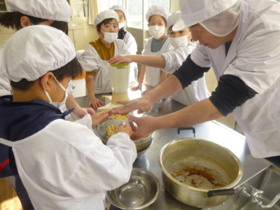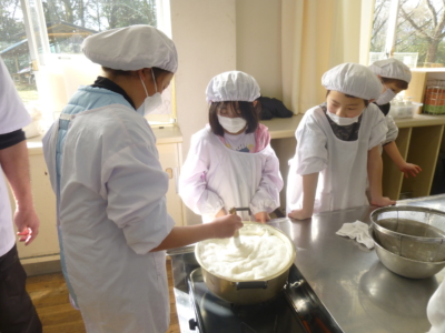 3学年では、収穫した大豆を使って、豆腐を作りました。阿智村の長田屋商店さんを講師に迎え、温度や水のバランスをみながら、丁寧に教えていただきました。焦がさないように順番にかき混ぜたり、豆乳やにがりの味にびっくりしたり、とても貴重で楽しい体験ができました。作った豆腐はとても濃厚で、おいしく出来上がりました。